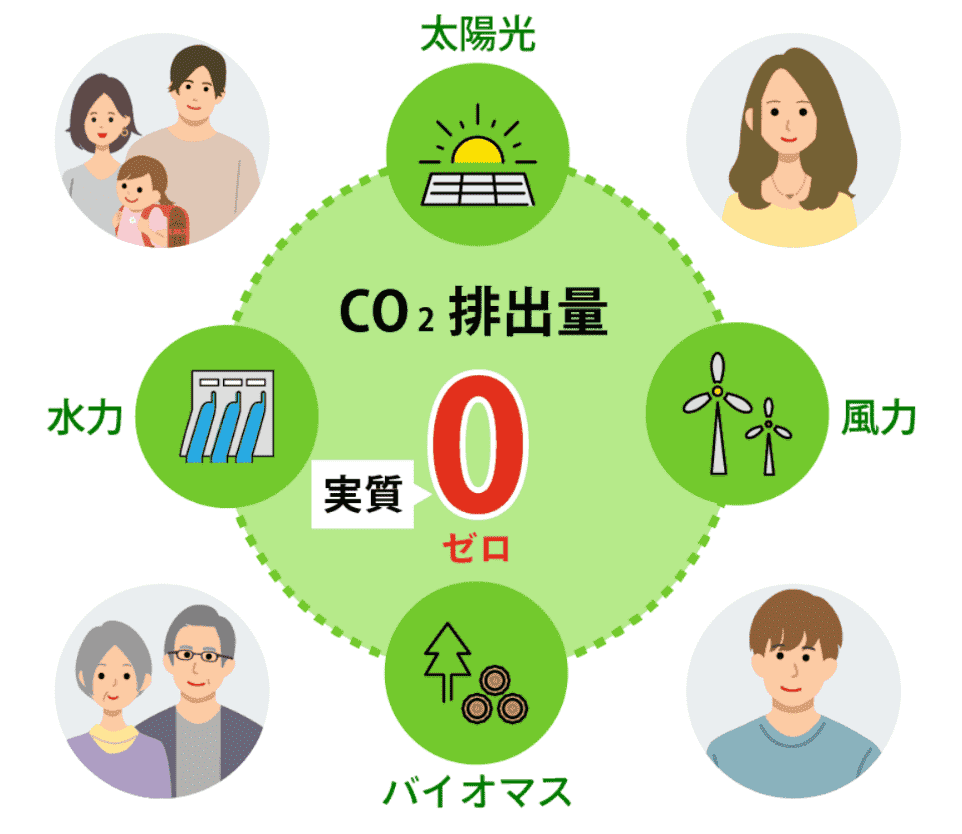 皆さまが生活でご使用される電気からのCO₂排出量が実質ゼロとなります。