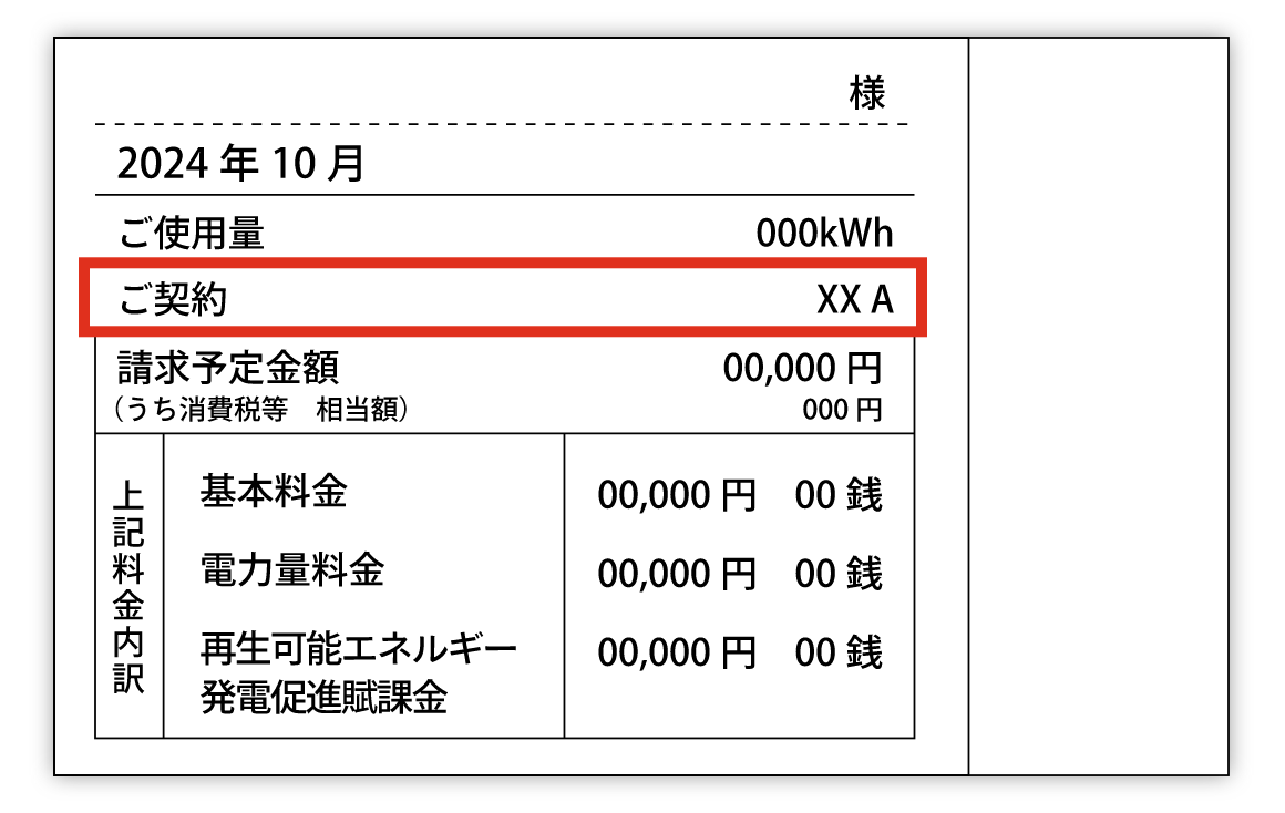 毎月届く検針票(電気ご使用量のお知らせ)の、「ご契約」の欄に記載されています。