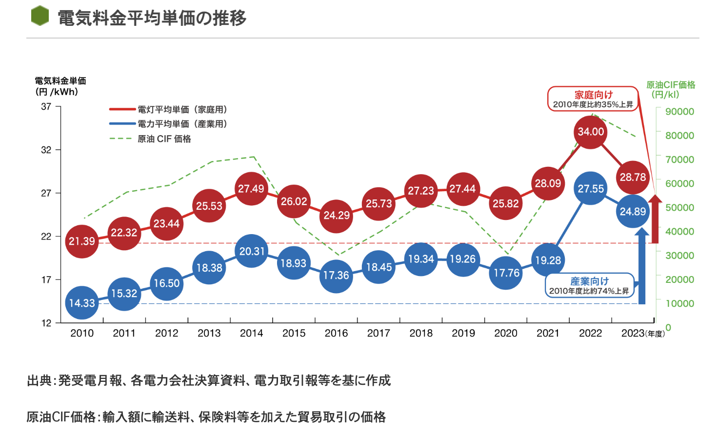 日本国内では長期にわたって電気代が上昇傾向にあります。経済産業省資源エネルギー庁によりますと、2011年に東日本大震災が発生して以降、電気代は家庭向けと産業向けとともに上昇傾向が続いています。その原因は、福島第一原発事故による原子力発電所の運転停止による燃料費の増加や、世界的な燃料価格の高騰などさまざまです。