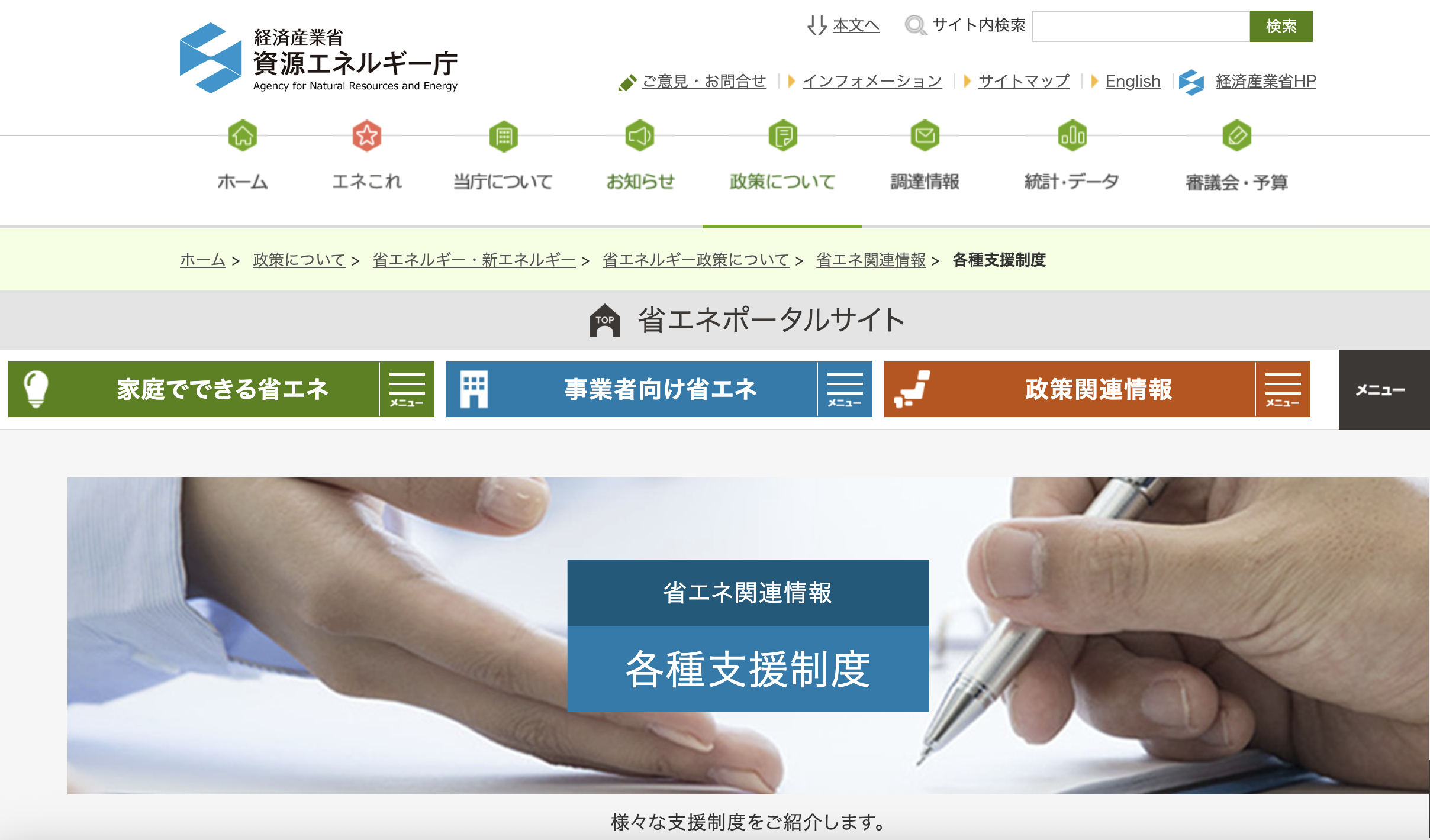 資源エネルギー庁ではホームページで「省エネポータルサイト」を設置して、さまざまな支援制度を紹介しています。