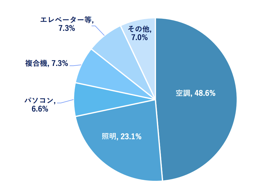 資源エネルギー庁によりますと、オフィスビルの夏の17時頃の電力消費の内訳は、空調が約49%、照明が約23%で、両方を合わせると72%を占めています。つまり、空調と照明の省エネルギー化を進めることが有効といえます。