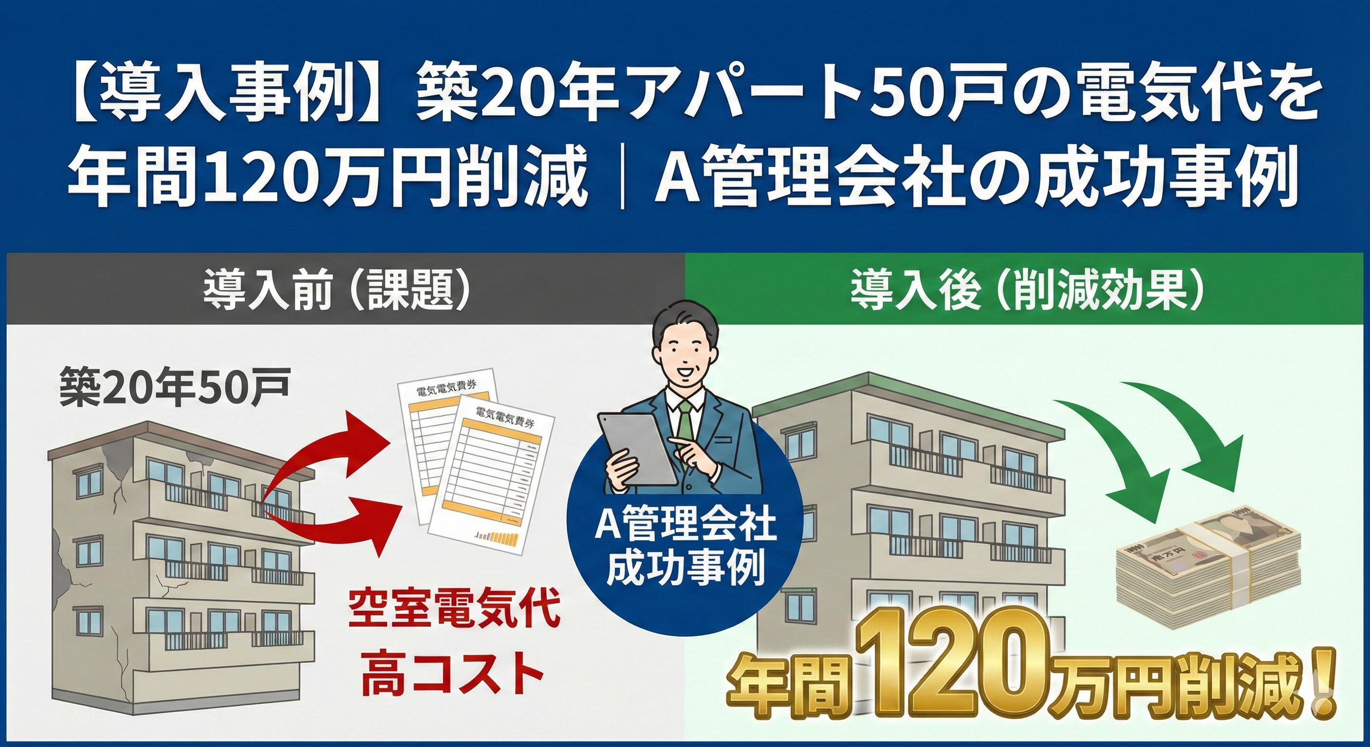 2026年1月9日【導入事例】築20年アパート50戸の電気代を年間120万円削減|A管理会社の成功事例