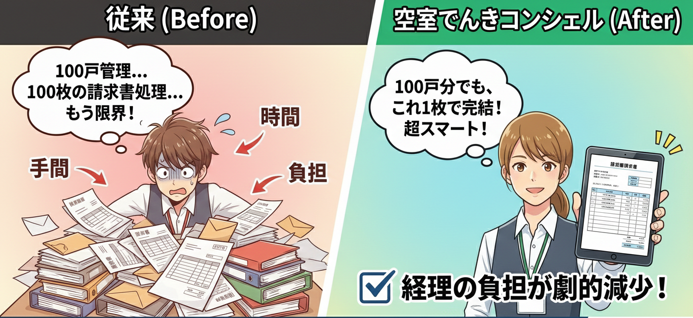 さらに、複数物件の請求書を1枚にまとめて送付するため、経理業務の負担も大幅に軽減されます。管理している物件が100戸ある場合、従来は100枚の請求書を処理する必要がありましたが、空室でんきコンシェルでは1枚で完結します。