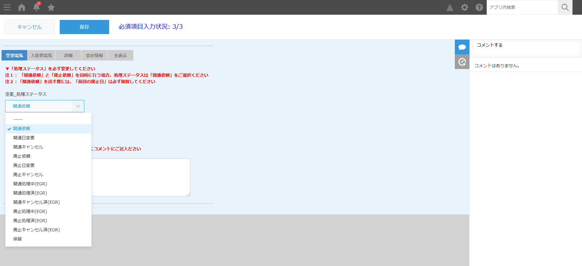 - 「空室電気」タブの「処置ステータス」から「開通依頼」を選択